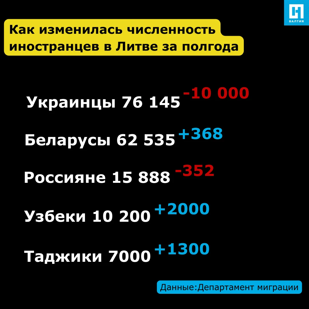 За полгода число украинцев, проживающих в Литве, сократилось на 10 тысяч человек, сообщил Департамент миграции. При этом украинская диаспора остается самой многочисленной в Литве: по состоянию на 1 июля, в Литве находятся чуть более 76 тысяч украинцев, более половины из них — военные беженцы.