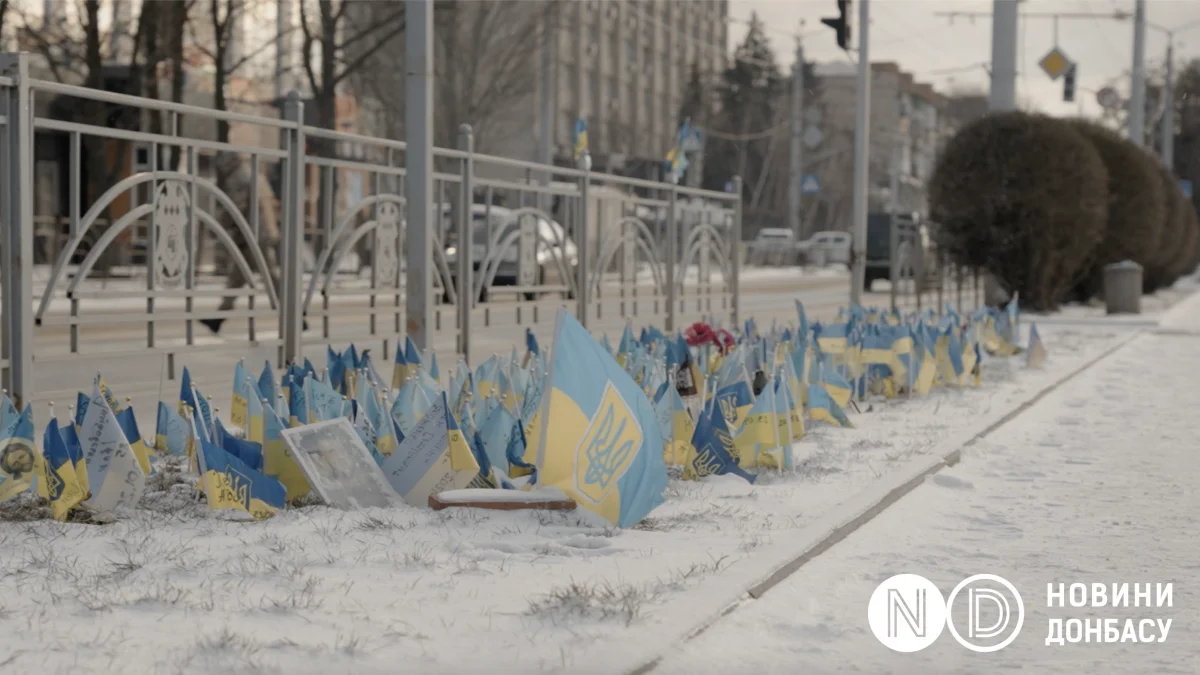 Созданный волонтерами мемориал с флагами Украины в память о погибших военных. Фото: Дмитрий Глушко/ Новости Донбасса