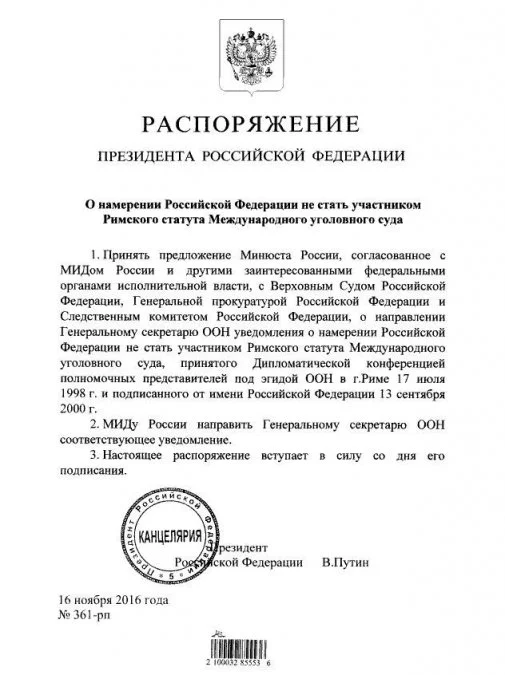 Россия откажется от участия в Римском статуте Международного уголовного суда. Такое распоряжение подписал президент Владимир Путин. Как утверждается в документе, с таким предложением выступил Минюст, который поддержали МИД и «другие заинтересованные федеральные органы исполнительной власти», а также Верховный суд, Генпрокуратура и Следственный комитет.