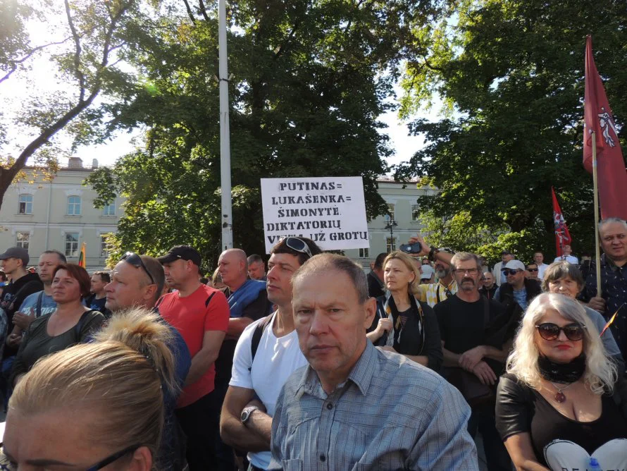 Разношерстная повестка митинга отражается на плакатах участников. «Выгнать Сороса из Литвы!», «Нет рабскому паспорту!», «Путин=Лукашенко=Шимоните: диктаторам место за решеткой!»,«Человек — не QR-код», «Президент, на двух табуретках не усидеть» — это только некоторые лозунги участников протеста. Пока со сцены доносятся слова поддержки сторонников митинга, в толпе курсирует волонтер Союза семей, продавая флажки с надписью «Вакцинации — нет» по евро за штуку.