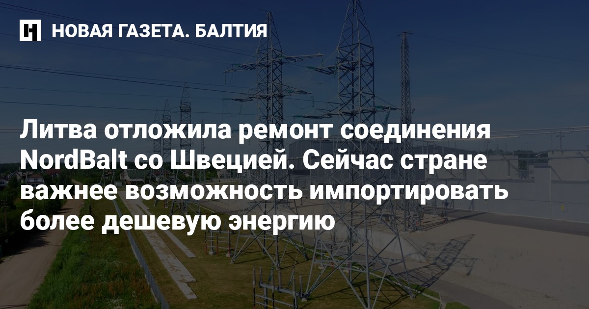 Литовский оператор системы передачи электроэнергии Litgrid на два месяца откладывает плановые ремонтные работы морского соединения со Швецией NordBalt. Из-за ремонта соединение временно отключают, но из-за ситуации на рынке сейчас важнее сохранить возможности импорта более дешевой энергии.