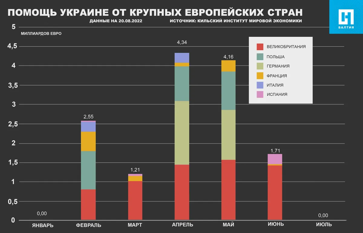 Поток европейской помощи для Украины почти иссяк в июле. Крупные страны ЕС, такие как Германия, Франция или Италия, не взяли на себя новых финансовых обязательств перед Украиной.