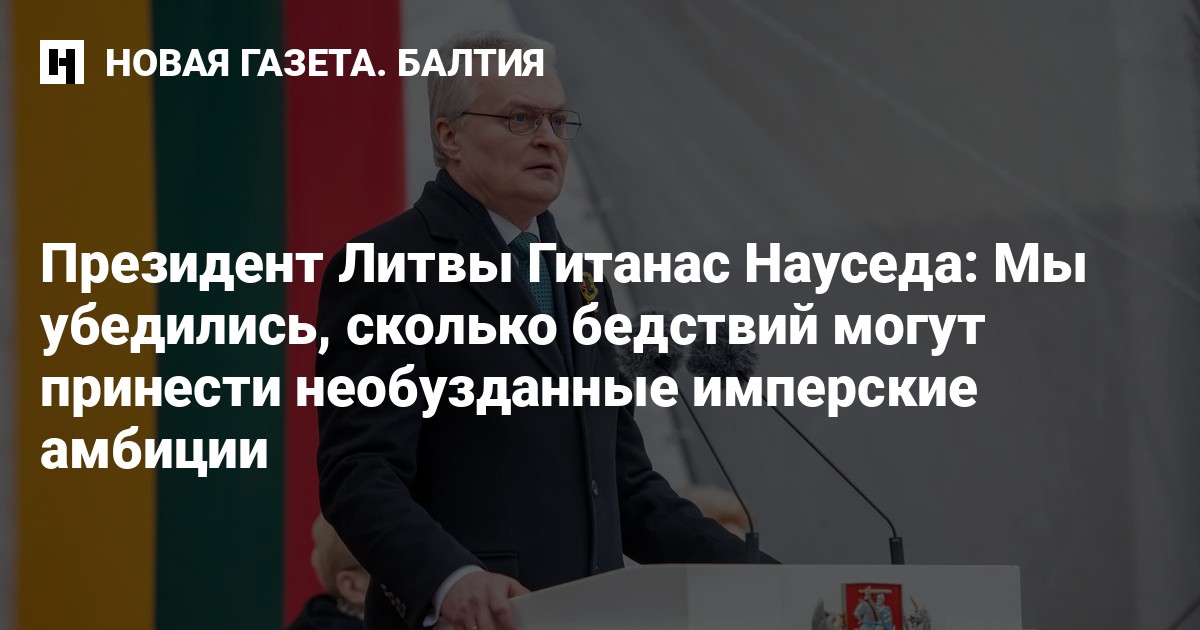 Вовремя необузданные имперские амбиции могут принести множество бедствий. Об этом на торжественной церемонии поднятия флагов стран Балтии по случаю Дня восстановления Литовского государства заявил президент страны Гитанас Науседа.
