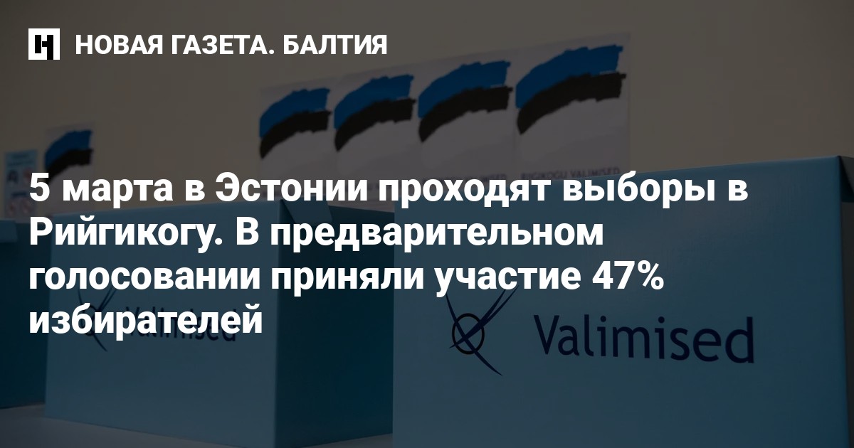В Рийгикогу баллотируются девять партий и десять независимых кандидатов, всего 968 кандидатов. По состоянию на 8.00 5 марта, в предварительном голосовании приняли участие 47,3% избирателей, пишет ERR.