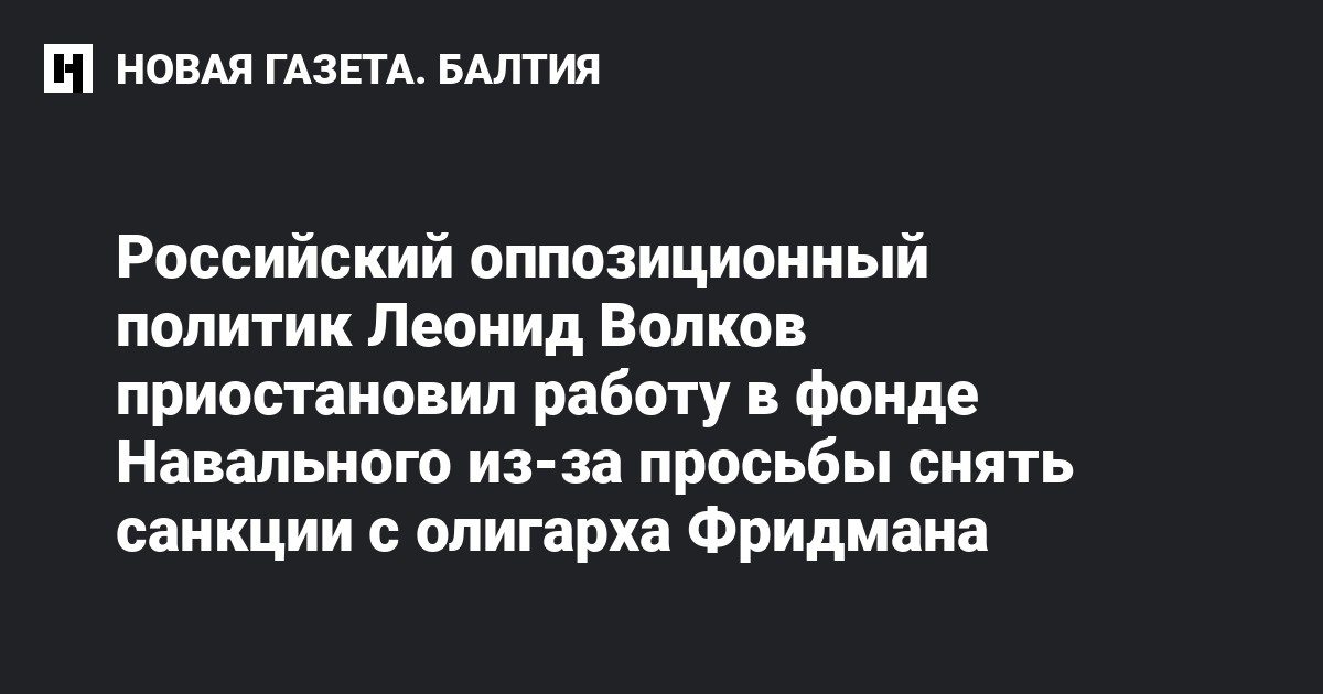 Российский оппозиционер Леонид Волков объявил, что берет паузу в общественно-политической деятельности в качестве председателя правления фонда ACF International из-за надписанного им письма в Евросоюз с просьбой снять санкции с олигарха Михаила Фридмана, сообщает Русская служба BBC.