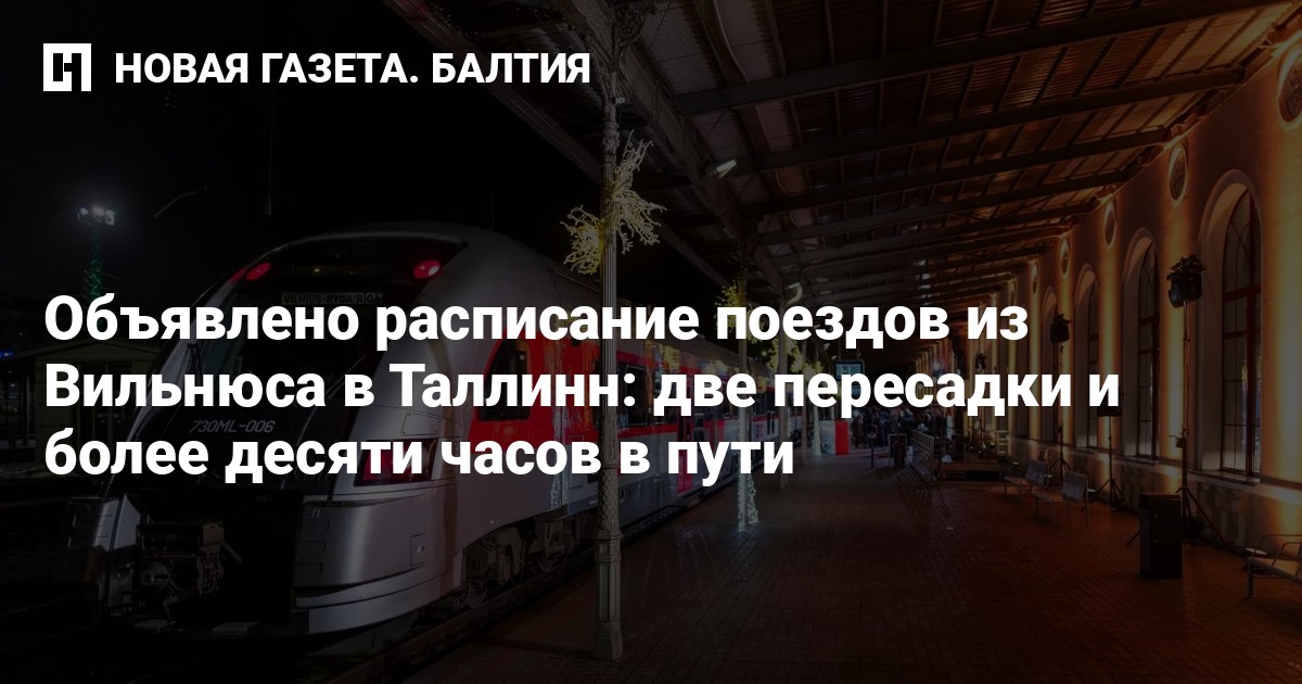 Эстонская компания «Elron» представила расписание поездов, которые свяжут Таллинн, Ригу и Вильнюс. Составы на маршруте Таллинн–Вильнюс будут выходить из эстонской столицы в 10.25, из Риги поезд отправляется в 14.11, прибытие в Вильнюс запланировано на 21.03.