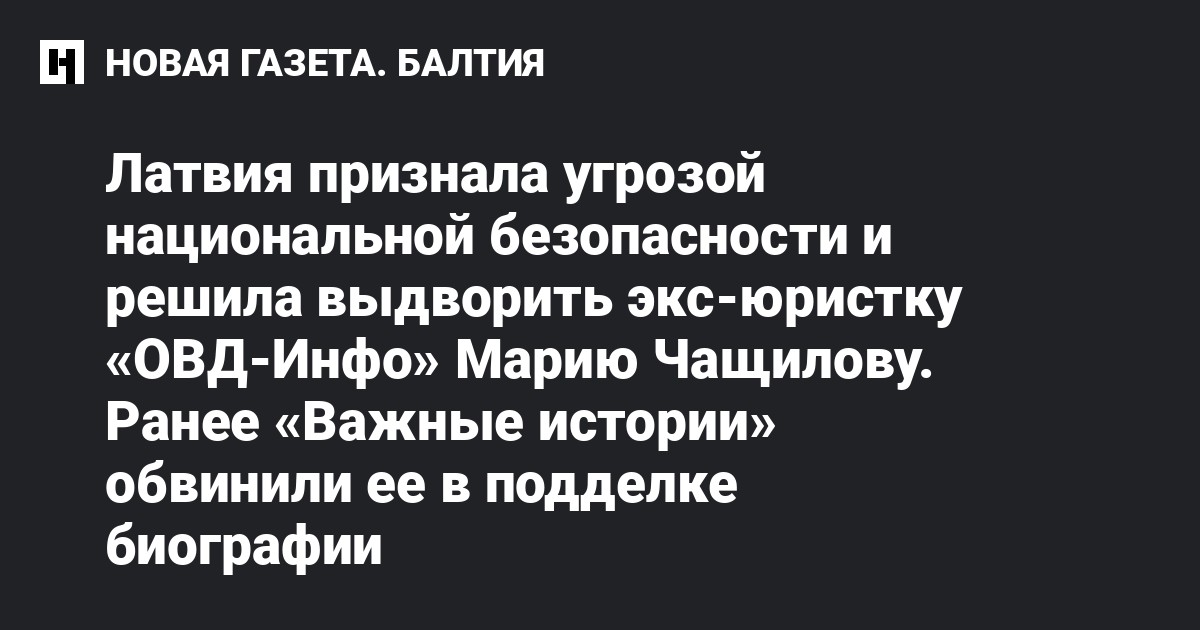 Власти Латвии подтвердили, что начали процедуру высылки из страны экс-сотрудницы «ОВД-Инфо» Марии Чащиловой, сообщает «Новая газета Европа» со ссылкой на Службу госбезопасности Латвии. В феврале 2025 года ведомство рекомендовало министру внутренних дел включить юристку в так называемый «черный список» — перечень иностранцев, которым запрещен въезд в страну.