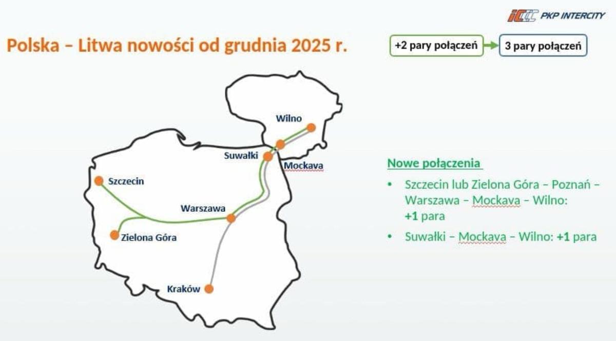 По данным портала, с декабря один из поездов через Варшаву будет ездить в Краков, а второй в Познань, затем в Щецин или Зелена-Гура.