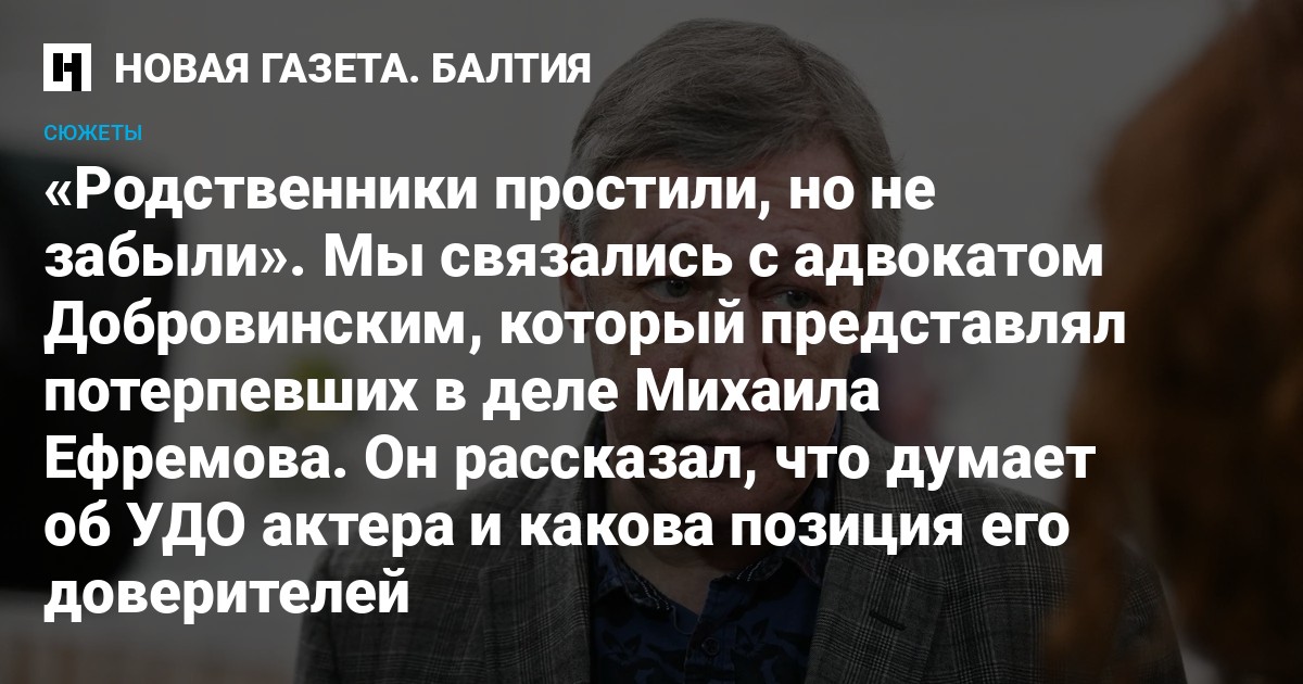 В 2020 году уголовное дело Ефремова было одним из самых скандальных сюжетов. В прессу моментально попадали подробности, а битва «звездных» адвокатов Пашаева и Добровинского надолго обеспечила таблоиды кричащими заголовками. Сейчас же, на четвертый год войны, освобождение давно забытого актера — скорее проходная новость. «Новая-Балтия» вспоминает, как проходил процесс и где теперь оказались участники скандальной истории, один из которых, адвокат Александр Добровинский, согласился прокомментировать последние события.