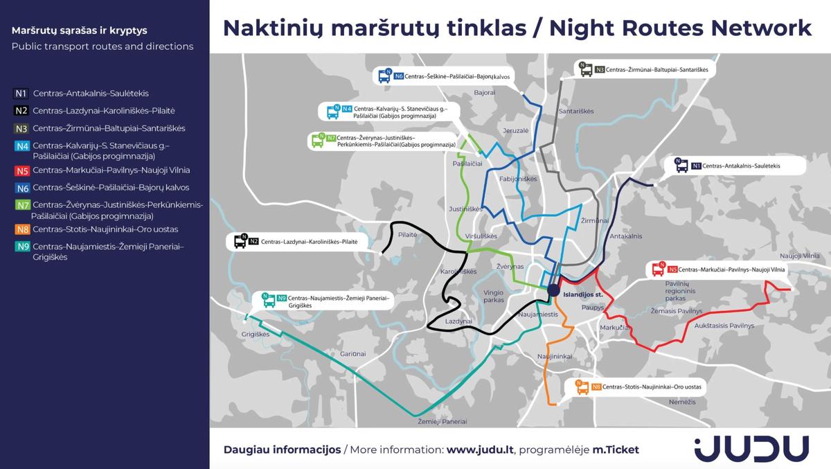 Девять новых ночных маршрутов свяжут центр города с районами Саулетекис, Пилайте, Сантаришкес, Пашилайчяй, Новая Вильня, Баеру Калнай, Аэропорт и Григишкес. Автобусы будут проезжать также через Антакальнис, Лаздинай, Жирмунай, Балтупяй, улицу Кальварию, Маркучай, Павильнис, Жверинас, Юстинишкес, вокзал, Науйининкай, Науяместис и Нижние Паняряй.