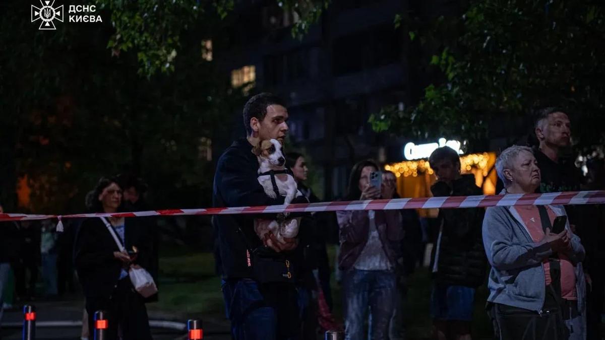 Люди стоят на улице под многоэтажкой, которая загорелась после российской дроновой атаки по Киеву, 4 мая 2025 года. Фото: ГСЧС