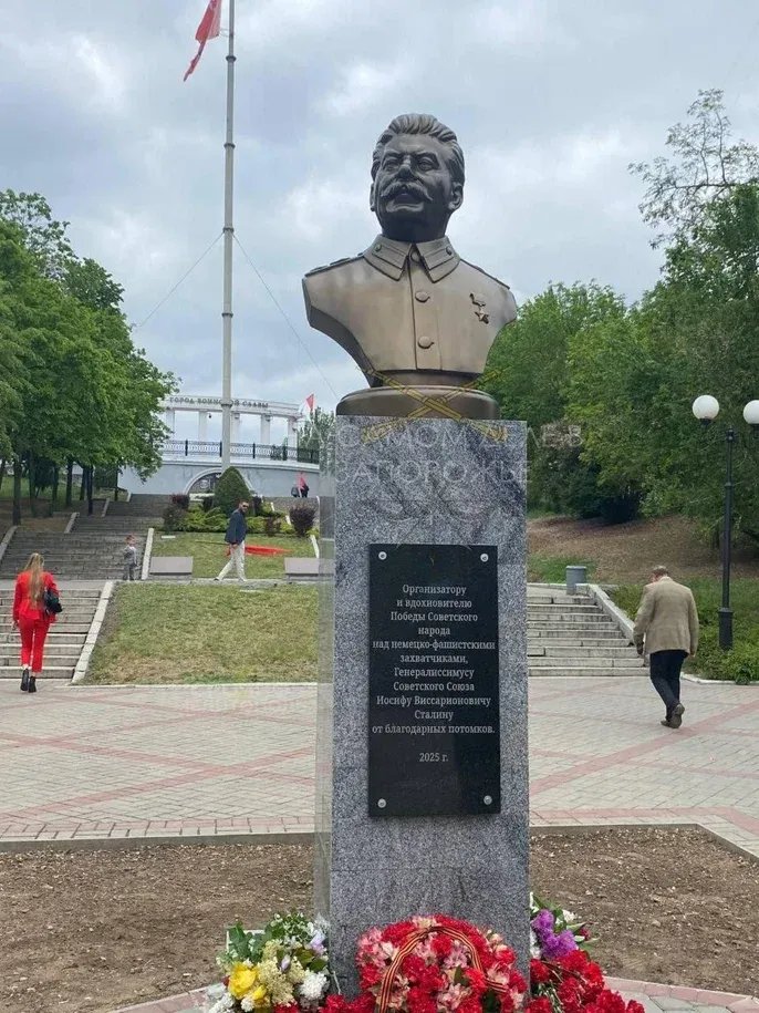 На открытии памятника выступил российский ставленник, местный «депутат» Олег Слюсаренко. Также на мероприятие пришли ученики местной школы, которые возложили цветы к памятнику Сталину.