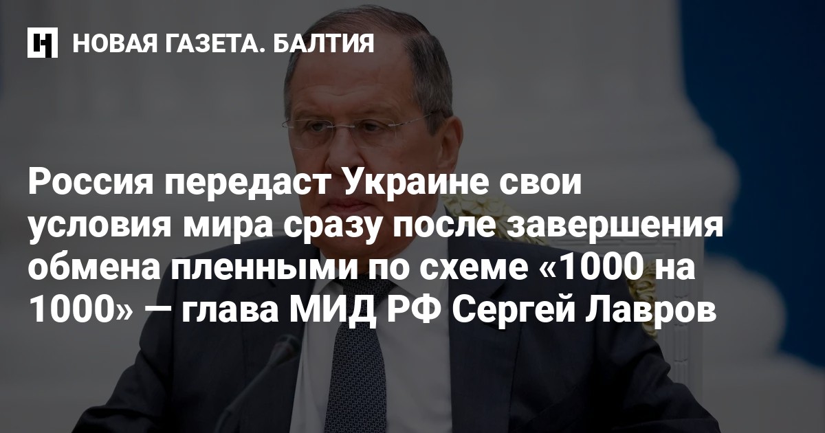 Глава министерства иностранных дел России Сергей Лавров заявил, что РФ передаст украинской стороне свои условия мира сразу после завершения обмена пленными по схеме «1000 на 1000».