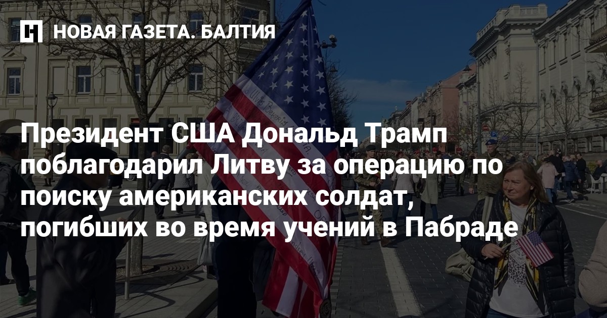 Президент США Дональд Трамп поблагодарил литовского коллегу Гитанаса Науседу, правительство, службы страны и весь народ Литвы за операцию по поиску и спасению американских солдат, пропавших без вести во время учений недалеко от полигона Пабраде, сообщает канцелярия президента Литвы.