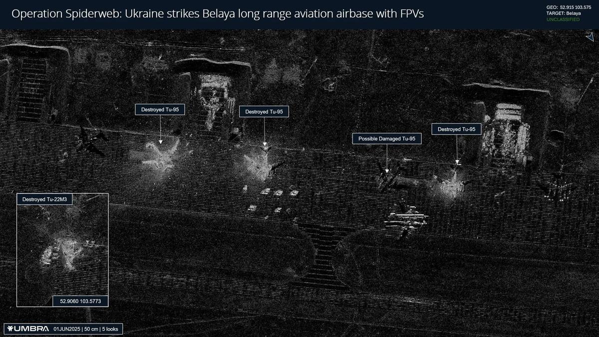 Он опубликовал первые спутниковые снимки военной авиабазы дальней авиации «Белая» в Иркутской области после масштабной операции СБУ. Снимки сделанны с помощью радара с синтезированной апертурой (SAR), позволяющего получить изображение рельефа поверхности.