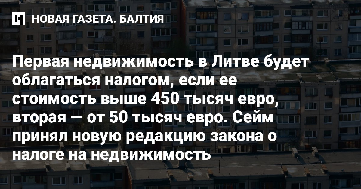 Сейм Литвы принял поправки к Закону о налоге на недвижимость, по которым первое жилье будет облагаться налогом, если его стоимость превышает 450 тысяч евро (для одного владельца) и 900 тысяч евро (для двух совладельцев).