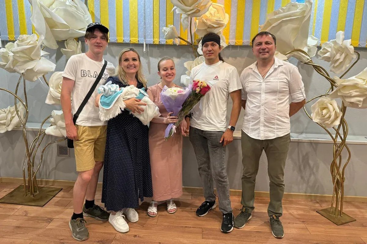 Алена с Исламом, своими родителями и братом на выписке из роддома