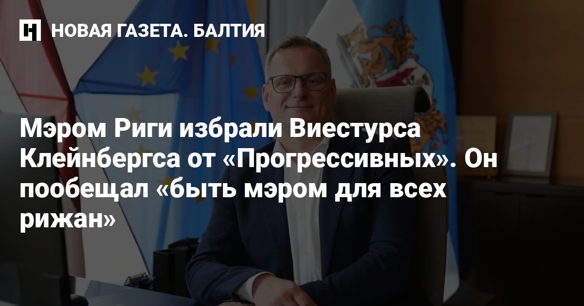 Новым мэром Риги выбрали Виестурса Клейнбергса от партии «Прогрессивные». За него проголосовали 34 депутата Рижской думы нового созыва, 22 были против, еще 4 не участвовали в заседании.