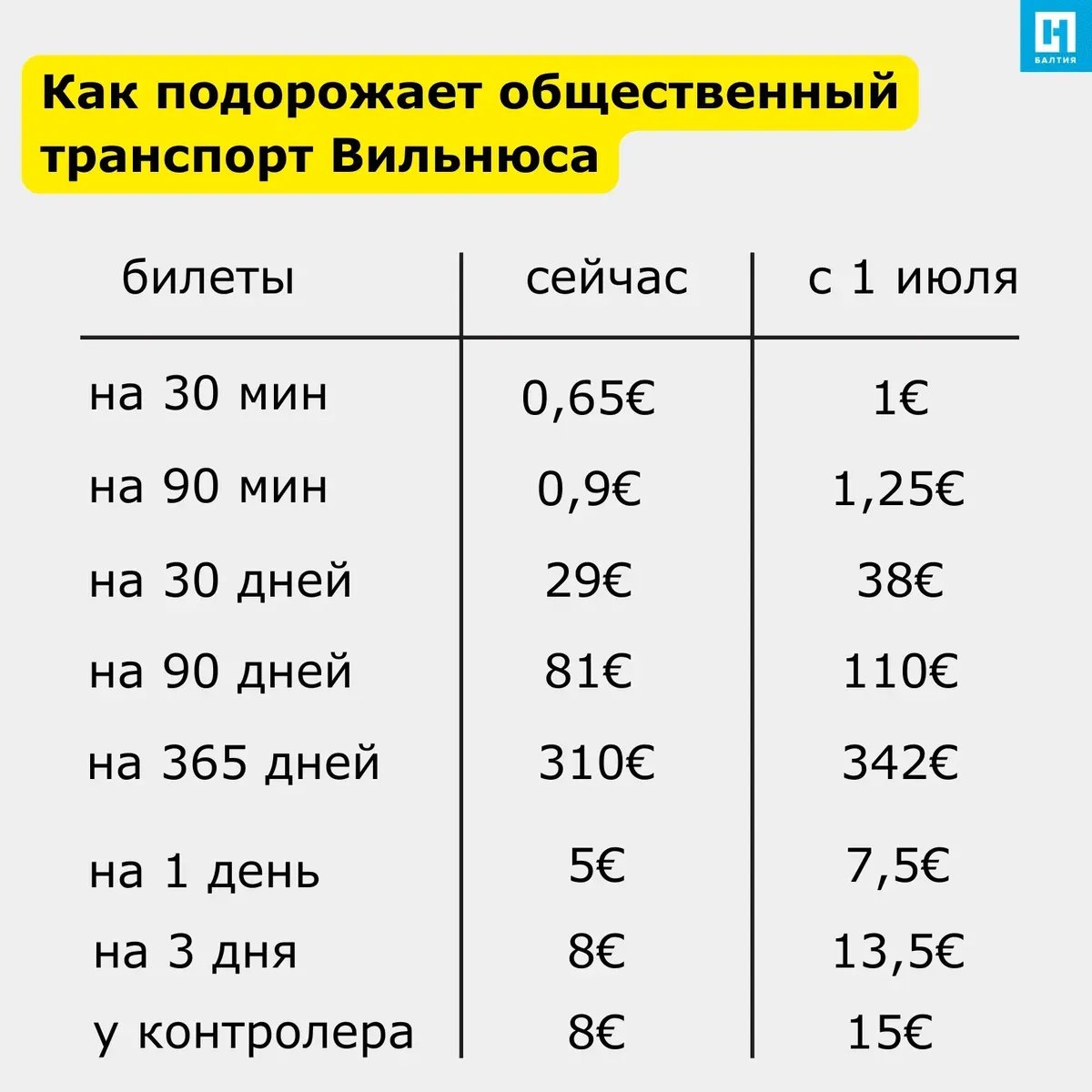 С 1 июля вступают в силу новые тарифы на билеты на общественный транспорт в Вильнюсе. Стоимость 60-минутного билета вырастет с 90 центов до 1,25 евро, а месячного проездного — с 29 до 38 евро. Дорожают и другие виды билетов.