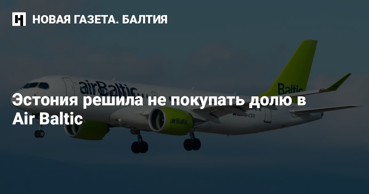 Напомним, Латвия предложила Эстонии и Литве приобрести долю в Air Baltic на тех же условиях, что и немецкой авиакомпании Lufthansa, которая вложит в Air Baltic 14 млн евро в обмен на долю участия в размере не менее 5%. Лейс подтвердил, что Эстонии было предложено приобрести долю участия в размере 5-10% за 14 млн евро.