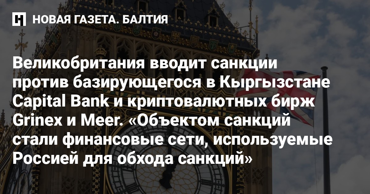 Великобритания вводит санкции против базирующегося в Кыргызстане Capital Bank и его директора Кантемира Чалбаева, а также против криптовалютных бирж Grinex и Meer. Помимо этого, санкции введены против инфраструктуры, стоящей за новым криптовалютным токеном A7A5, обеспеченным рублем. «Этот токен переместил 9,3 млрд долларов через специализированную криптобиржу всего за четыре месяца и был специально создан для обхода западных санкций», — отметили власти Великобритании.