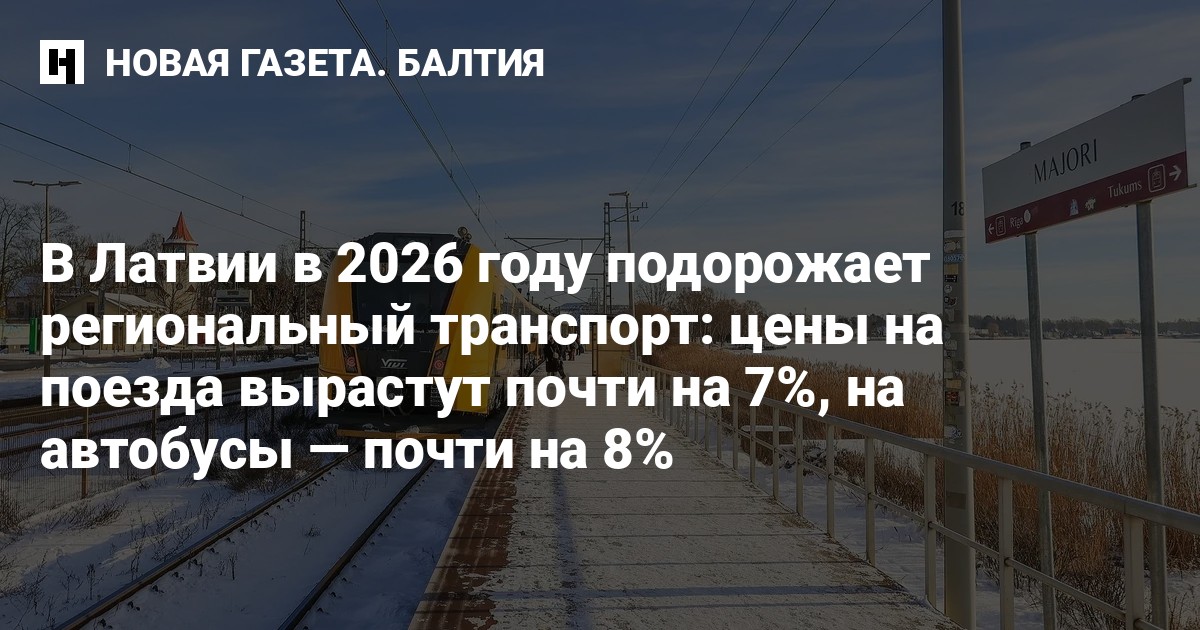 С 15 января 2026 года в Латвии подорожают билеты на региональный общественный транспорт, сообщает LETA. Билеты на поезда в среднем вырастут на 6,6%, на автобусы — на 7,5%.