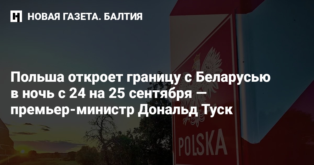 Польша откроет границу с Беларусью в ночь с 24 на 25 сентября, заявил премьер-министр Дональд Туск на заседании правительства. Решение касается как автомобильных, так и железнодорожных пунктов пропуска.