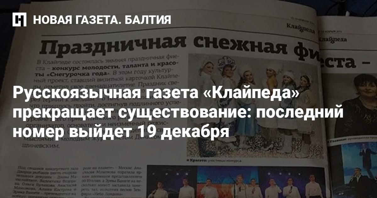 Еженедельная газета «Клайпеда» на русском языке прекращает существование после 15 лет работы. Последний номер издания выйдет 19 декабря, передает LRT.