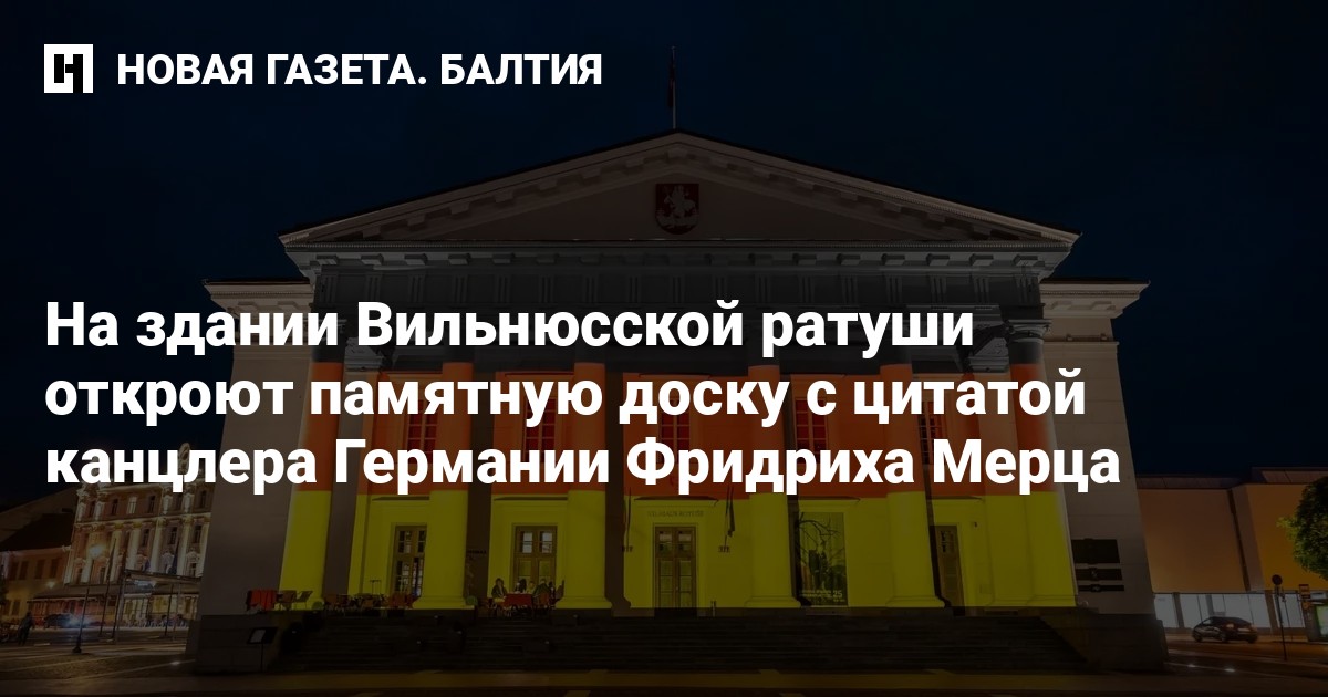 1 декабря в 13.00 на здании Вильнюсской ратуши откроют памятную доску с цитатой канцлера Германии Фридриха Мерца. «Безопасность Литвы — это и наша безопасность. Защита Вильнюса — это защита Берлина», — сказал Мерц на церемонии открытия немецкой бригады в Литве в мае этого года. Цитата на табличке будет написана на литовском и немецком языках.