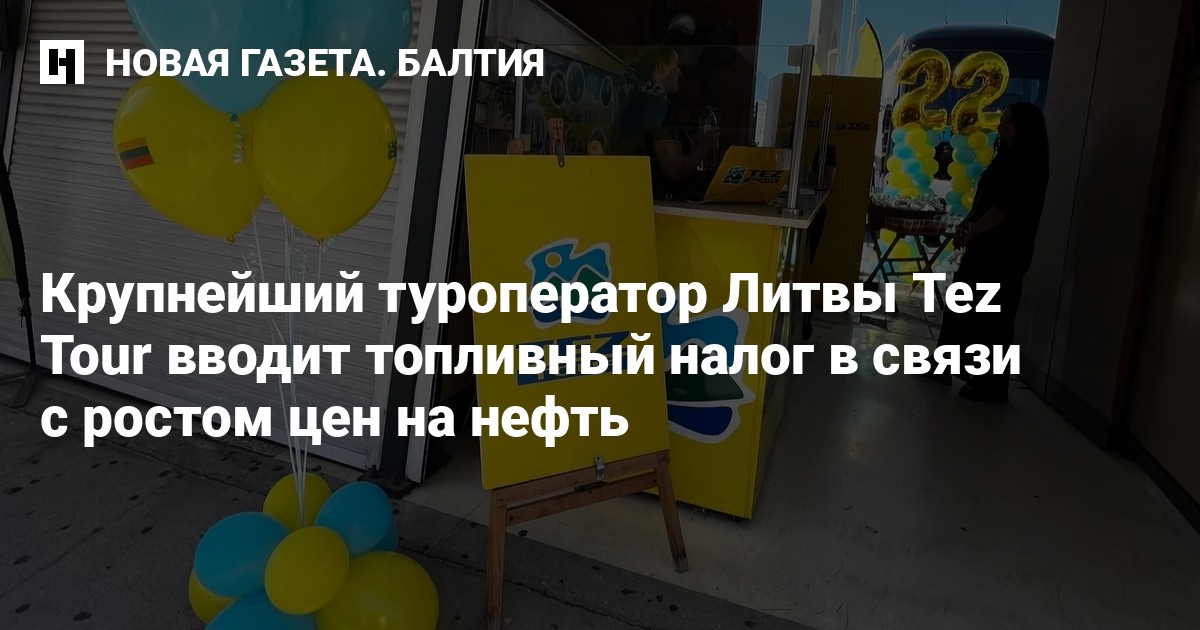 Крупнейший туроператор Литвы Tez Tour вводит топливный налог в связи с ростом цен на нефть из-за войны на Ближнем Востоке. Клиентам, уже купившим туры, придется доплатить от 30 до 82 евро в зависимости от дальности поездки, передает LRT.
