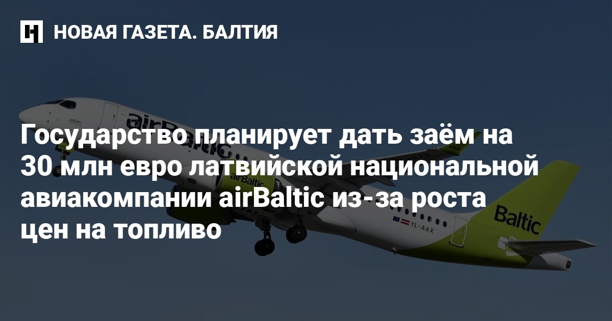 Латвийской национальной авиакомпании airBaltic планируют предоставить краткосрочный заём на 30 млн евро из-за резкого роста цен на авиационное топливо. Об этом на пресс-конференции рассказал министр сообщения Атис Швинка. По планам, кредит будет погашен до 31 августа этого года, передает LETA.