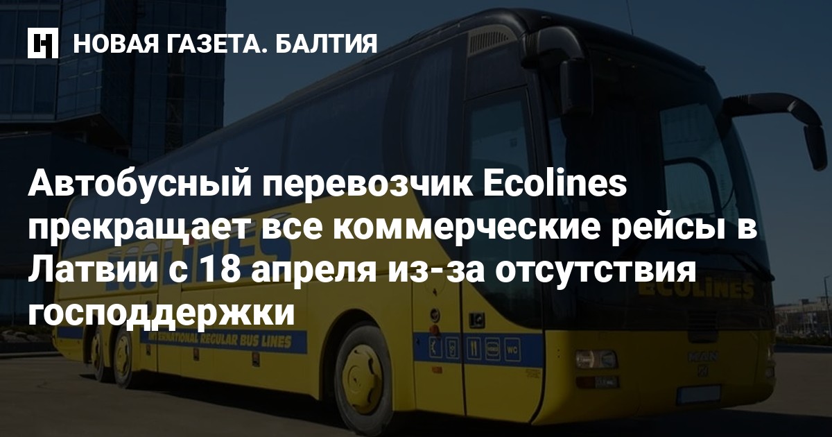 Автобусный перевозчик Ecolines (SIA Norma-A) с 18 апреля прекращает все коммерческие автобусные рейсы в Латвии. Речь идет о маршрутах Рига-Вентспилс, Рига-Резекне, Рига-Балви, Рига-Балтинава и Рига-Жигури, пишет LSM.